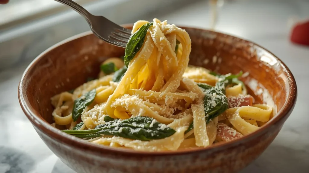 Fold in fresh spinach, stirring until wilted. Adjust thickness with reserved pasta water if needed.